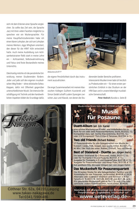 Meine Erfahrungen im professionellen Bereich zeigen mir, dass auch die Beschäftigung mit Nebeninstrumenten wie Bassposaune und Euphonium einen Unterschied bedeuten kann. Ebenso ist mir das Spiel in der Bigband ein besonderes Anliegen. Es fördert nicht nur die stilistische Vielseitigkeit und das Zusammenspiel, sondern ist auch für die spätere Berufspraxis vieler Posaunist:innen ein zentrales Tätigkeitsfeld.